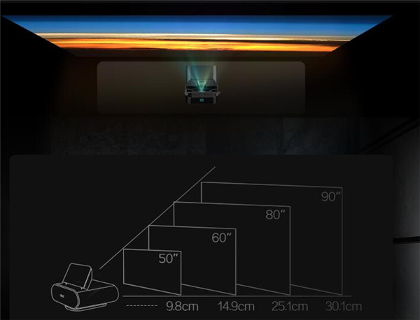 AOC智能投影仪C1采用德州仪器的投影芯片技术,结合AOC 80年的专业显示背光技术,不断优化调试,打造了0.22:1的超短焦,将投射比缩短至 0.22:1, 投影仪距离墙面30cm即可投出90英寸的超大画面,在家中体验电影院的震撼视觉,同时还解决了长焦投影仪画面容易被遮挡的问题。