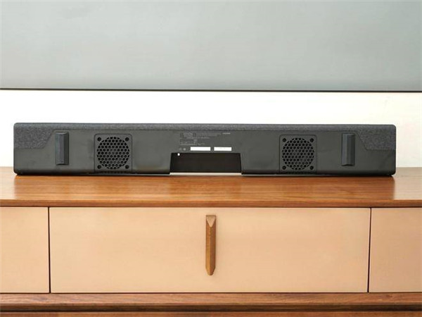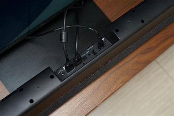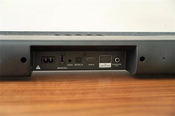 音响背部居中凹槽为接口区域,除蓝牙5.0无线连接外,其机身保留了Aux模拟信号输入、数字光纤输入、HDMI输入、HDMI eARC输入等多种输入接口,以及低单独的低音炮输出接口。