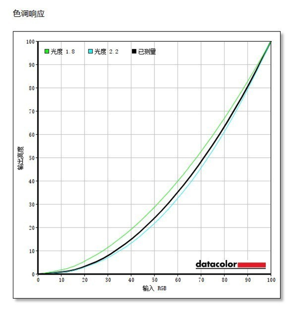 色调响应方面,已测量的黑色曲线应该尽量和浅蓝色的“光度2.2”曲线保持一致,可以看到实测的黑色曲线和“光度2.2”稍有偏差,色调响应的表现不错。