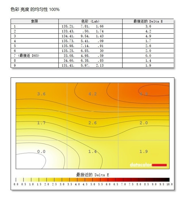 在色彩均匀性的测试中,可以看出AGON AG275QXR中间靠右位置的第7象限最接近D65的标准,显示器面板的第3象限与标准色温值有一定差距,差距数值为4.9.显示器整体的色彩均匀度表现优秀。
