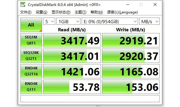 使用CrystalDiskMark测速软件对这款SSD进行测试,从测试结果可以看到读取速度高达3417.49MB/s,写入速度可以高达2919.21MB/s。