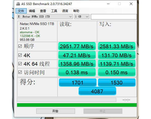 使用AS SSD Benchmark测速软件对绝影NV3000进行测试,从测试结果可以看到,读取速度可以达到2951.77MB/s,写入速度可以高达2581.33MB/s,这速度相当可以的。