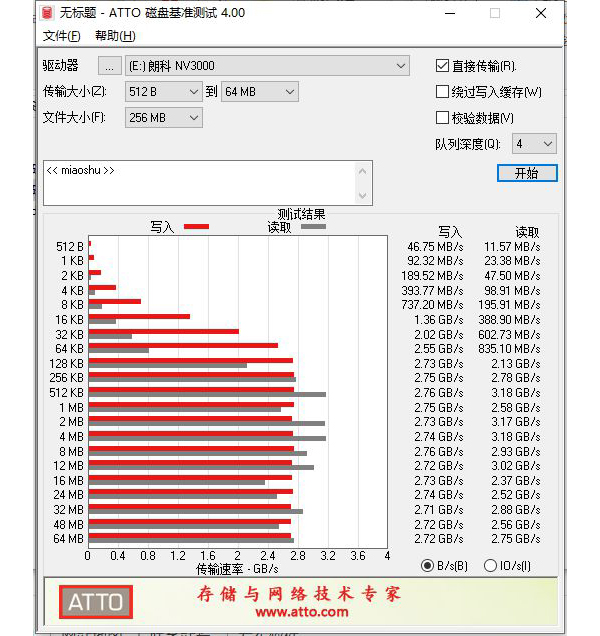 ATTO磁盘基准测试是一款简单易用的磁盘传送速率检测工具,可以用来检测硬盘、U盘、存储卡及其它可移动磁盘的读取及写入速率。该从测试结果来看,读取最高可以达到3.18GB/s,写入最高可以达到2.76GB/s,整体表现还不错。