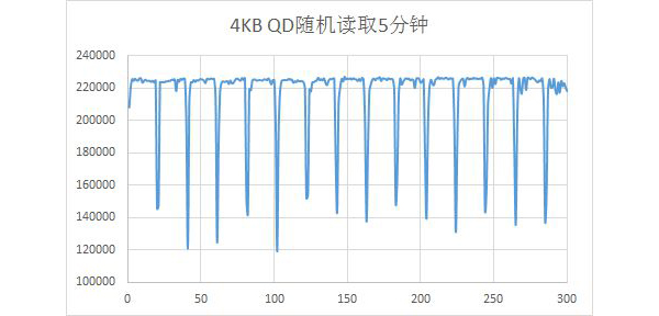 使用Iometer测读写试软件对这款SSD进行五分钟的4KB QD32的随机读取测试,从测试结果可以看到每秒的读取次数稳定在220K左右,这读取性能还是比较稳定的。