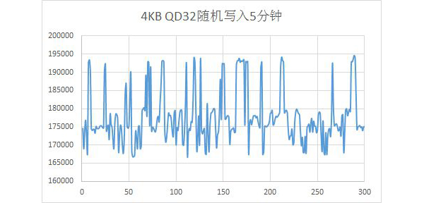 使用Iometer测读写试软件对这款SSD进行五分钟的4KB QD32的随机写入测试,从测试结果可以看到每秒的写入次数波动性比较大,主要集中在170-195K次。