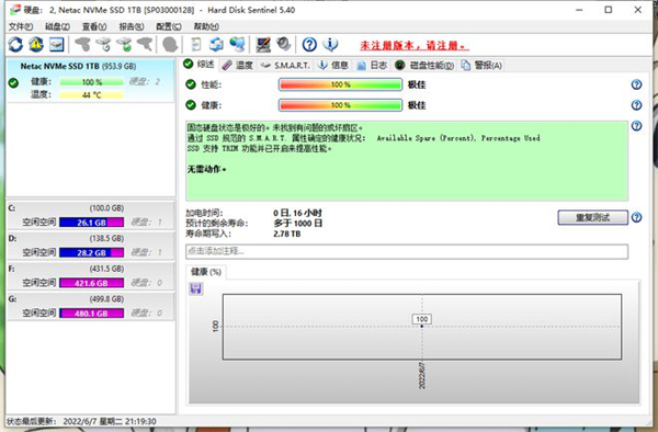 电脑在长时间运行过程中,散热是一个很大的问题,如果SSD不能有很好的散热,会影响其性能的发挥,同时影响电脑运行的稳定性。使用HD sentinel进行运行测试,经过16小时的运行结果可以看到这款SSD整个过程状态良好,运行过程中平均温度也只有44℃,这优异的散热性能还得归功于这款SSD采用了优异的散热材质,让运行温控的比较不错。