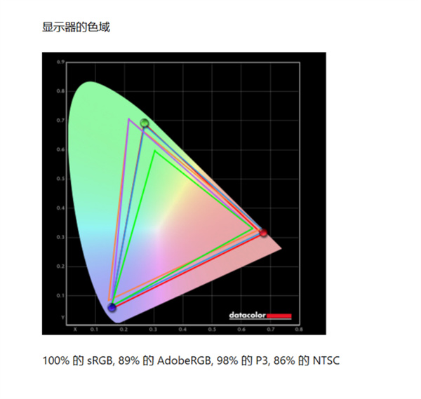 经过测试,飞利浦279M1显示器的sRGB色域的覆盖度为100%,Adobe RGB色域的覆盖度为98%,P3色域的覆盖度为93%,NTSC色域的覆盖为86%。