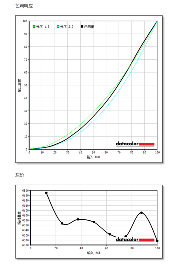 色调曲线方面,光度2.2是一个标准值,飞利浦279M1显示器的测试结果介于光度1.8和光度2.2之间。而灰阶测试上,表差为20K,最大差异值不到200K,在20%-80%亮度之间的色温都是非常稳定的。