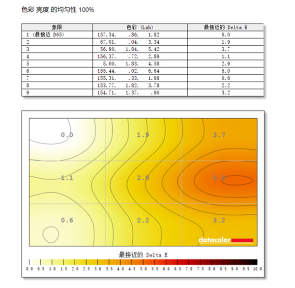 色彩亮度均影响方面,在屏幕的左上角第一象限最接近D65标准,最大差距数值为5.0,面板的绝大部分差异并不大。