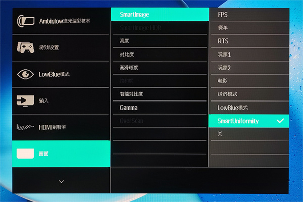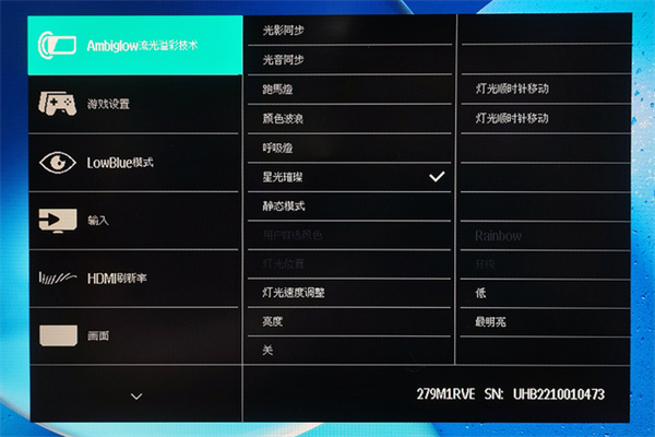 飞利浦279M1显示器的背部灯效可以在菜单中进行设定,有非常丰富的灯效供用户选择。