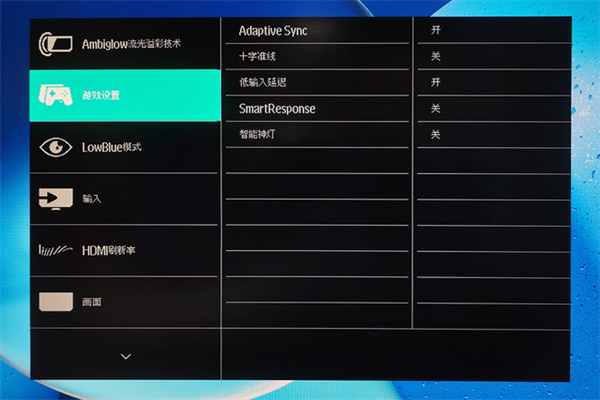 作为一款专业电竞显示器,飞利浦279M1具备较强的游戏性能,不仅具备了4K画质以及144Hz的高刷新率,在设置中也加入了游戏模式,并且提供瞄准辅助功能,可以说对于游戏的支持已经非常全面。