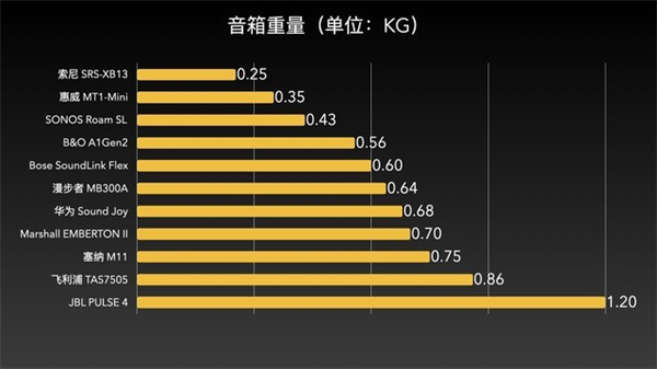 在评测的11款户外音箱中,索尼SRS-XB13的重量最轻,和一部手机的重量相当,加上它小巧的外形,非常适合在户外徒步旅行的时候使用。而JBL PULSE 4这款音箱的重量最重,达到了1.2公斤,它还是适合平时摆放在家里使用,或者放进汽车的后备箱里。