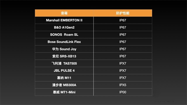 这里以IP67举例,6代表了灰尘无法进入音箱内部从而造成破坏,7代表了设备在1米深的水中浸泡30分钟后仍能正常使用。IP后面的X则是厂商没有给出保护信息。需要注意的一点是,随着日常使用过程中音箱的老化等问题,音箱的防护性能并不是一成不变的,会随着使用时间而降低。