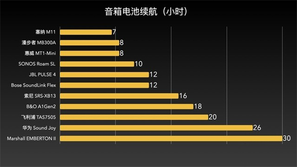 漫步者的MB300A和惠威的MT1 mini续航最短,只有8小时,如果在户外使用的话需要时刻注意电量。马歇尔 EMBERTON II和华为 Sound Joy表现都很不错,都超过了20小时。B&O A1Gen2官方给出的最长续航达到了18小时,也完全够使用一整天了。