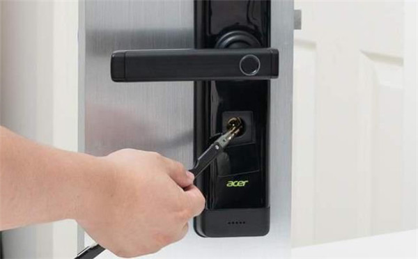 而智能门锁下半段是密码区域,通电触发后数字键盘会亮起,数字键盘中间是磁卡感应区,还有两个明显触控图标,一个是上锁键,还有一个是门铃键。在acer logo下方,是人体感应传感器,再往下就是机械钥匙孔位置。