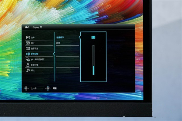 在其它功能方面,显示器还配备了两个2.5W扬声器,声音表现清澈明亮。用户通过OSD菜单或控制器设置,可以快速完成音量调节和静音操作。