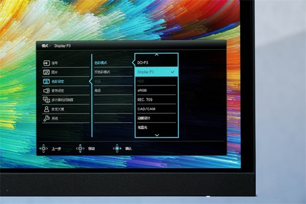 通过上面的图片展示,可以看出明基 PD3420Q作为一款专业显示器,配备了丰富的色彩模式。不仅有DCI-P3、Display P3两种P3色域效果可供选择,还有sRGB、REC.709、CAD/CAM、动画设计、低蓝光等多种专业模式,以此来满足不同场景下画面显示需求。