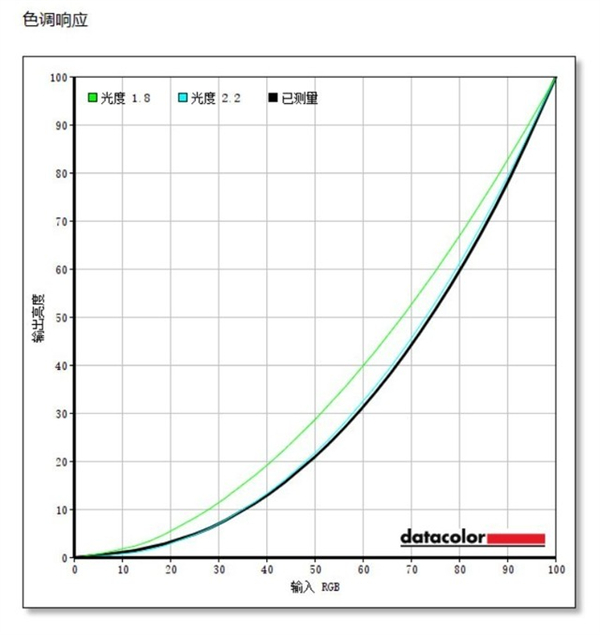 色调响应方面,已测量的黑色曲线应该尽量和浅蓝色的“光度2.2”曲线保持一致,可以看到实测的黑色曲线和“光度2.2”近乎重合,色调响应的表现非常好。