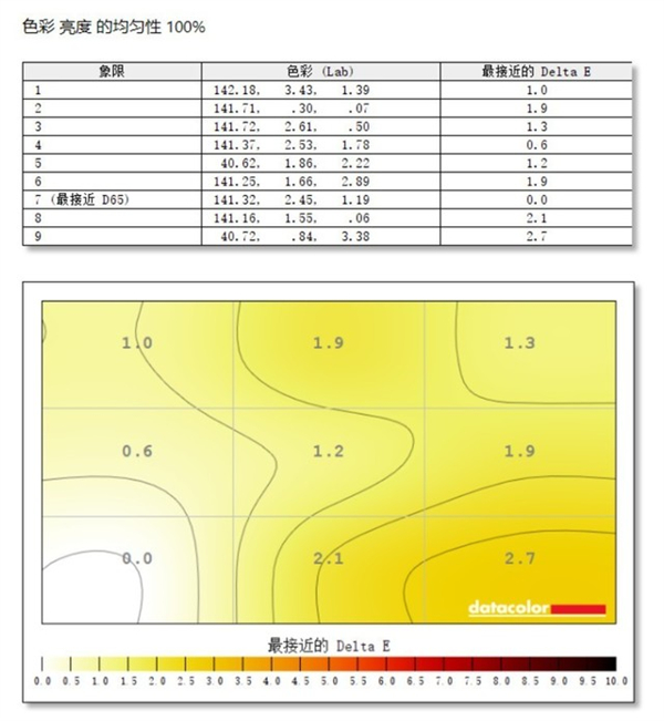 在色彩均匀性的测试中,可以看出明基 PD3420Q中间靠右位置的第7象限最接近D65的标准,显示器面板的第9象限与标准色温值有一定差距,差距数值也仅为2.7.显示器整体的色彩均匀度表现非常好。