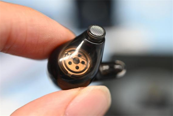 打开充电仓后可以看到HiFiAir耳机,这副耳机做得实际很小,造型也是魔浪一贯的风格,是一种水滴形的设计,耳机靠内侧的一面还是透明的,看上去很有科技感,和普通的耳机不太一样,虽然这耳机体积不大,但确实是采用了一圈一铁的结构,充分能保证了音质的表现。