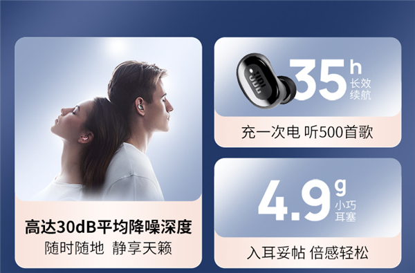 在主动降噪方面,JBL Live Free 2采用了创新的智能自适应数字降噪和被动隔音技术,智能自适应降噪技术可以根据周围的环境噪声,精准地生成反向声波从而抵制低宽带来的噪声,有效地隔离外界噪音。配合上贴合度极高的耳塞设计,带来非常不错的被动隔音效果,最高可实现30dB的深度降噪效果,无论是在地铁通勤路上,还是在运动锻炼,都满足我们对耳机降噪的使用需求。