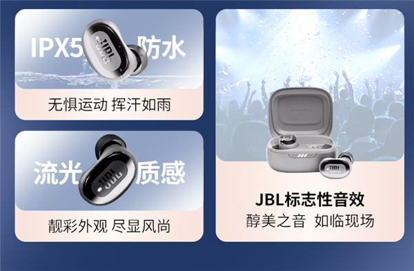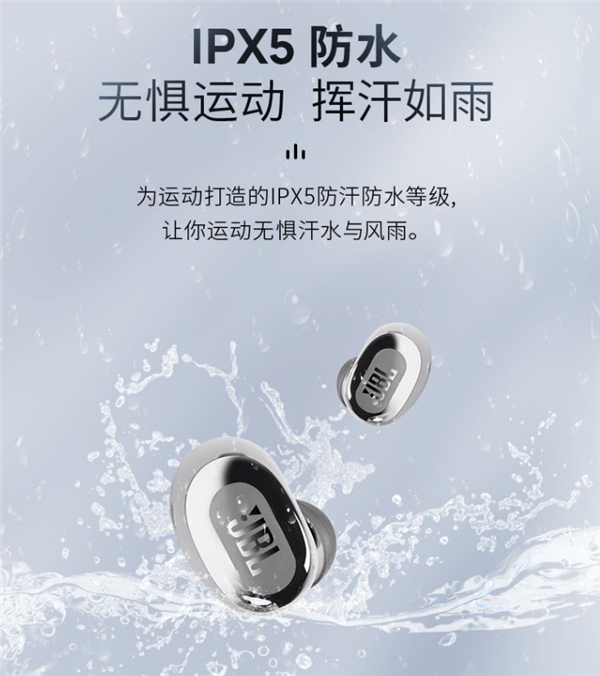 当然,JBL Live Free 2也是一款有着运动属性的真无线蓝牙耳机,它除了佩戴舒适、牢固,在运动锻炼时不易脱落之外。它还是一款支持IPX5级别的防汗防水功能的真无线耳机,在运动中佩戴,即使是大汗淋漓又或者是户外跑步锻炼时突然下起雨来,也不用担心会对耳机造成伤害。