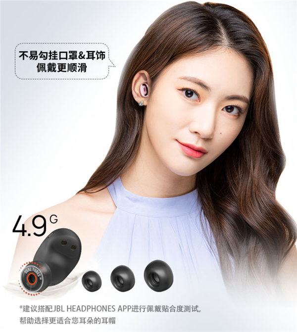 JBL Live Free 2采用了椭圆形的硅胶耳塞套设计,相比传统的圆形耳塞套在佩戴时会更加适合耳道形状,在紧密贴合耳道的同时还可以有效消除胀痛感。搭配单个耳机仅4.9克的重量,在平时的佩戴中,可以说带来了非常舒适的佩戴体验。