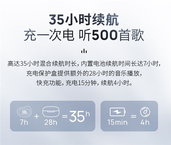 在充电和续航方面,充电盒支持快充模式,只需充电15分钟就能为JBL Live Free 2带来4小时的续航。另外,在充电盒与耳机满电状态下,累计续航时长可以达到35小时,如果每天通勤或者运动锻炼听音乐4~5个小时,基本上只需充一次电就可以满足你一个星期的听歌需求。