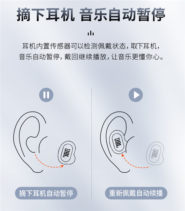 同时,在JBL Live Free 2上还加入了佩戴传感器,可以实时检测佩戴状态,比如在我们取下耳机时,音乐就会暂停播放,而重新佩戴,音乐则会自动恢复播放,无需拿出手机进行操作,提升了耳机的使用体验。
