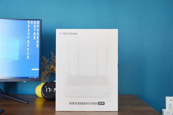 京东云无线宝AX3000后羿外包装是白色立体包装盒,正面有产品图片,左上角是京东云无线宝Logo,图片的正下方有产品具体型号,整个包装看起来比较简约。