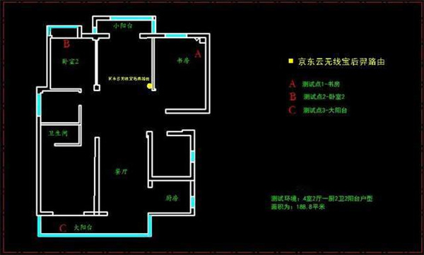 在一个4室2厅1厨2卫2阳台的户型中,整屋面积大概188平米,这比普通百平米左右的常规户型明显要大更宽广,测试效果更有力度。把京东云无线宝AX3000后羿安装在客厅电视旁边,分别选取全屋最角落的三个位置:书房A点、卧室B点、大阳台C点,来测试信号覆盖情况。