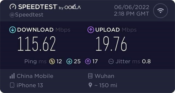 在与京东云无线宝AX3000后羿有一墙之隔的A点位置,其信号满格,无线网下载速率达到115.62Mbps,上传速率为19.76Mbps,和100M有线宽带速率基本无差。