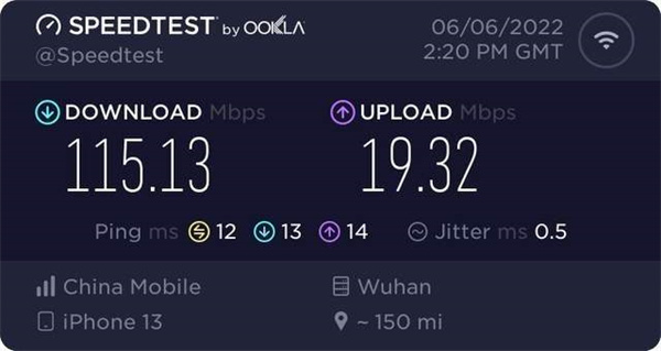 同样与京东云无线宝AX3000后羿有一墙之隔的B点位置,终端设备显示无线网信号也是满格,无线网下载速率达到115.13Mbps,上传速率为19.32Mbps,网速和信号都表现的相当稳定。