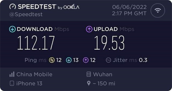 距离京东云无线宝AX3000后羿最远又有隔墙的C点位置,显示无线网信号一样是满格覆盖,无线网下载速率达到112.17Mbps,上传速率为19.53Mbps,虽有小幅波动,但波动值并不大,也是妥妥的跑满100M宽带。