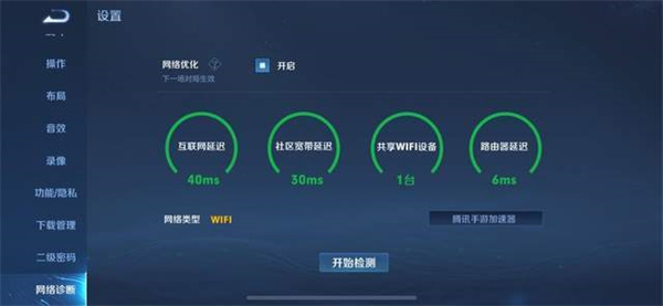 开启手游加速器,显示路由器的延迟只有6ms,相比较互联网产生的40ms延迟和社区宽带产生的30ms延迟,不得不说京东云无线宝AX3000后羿低延迟真的很出色。