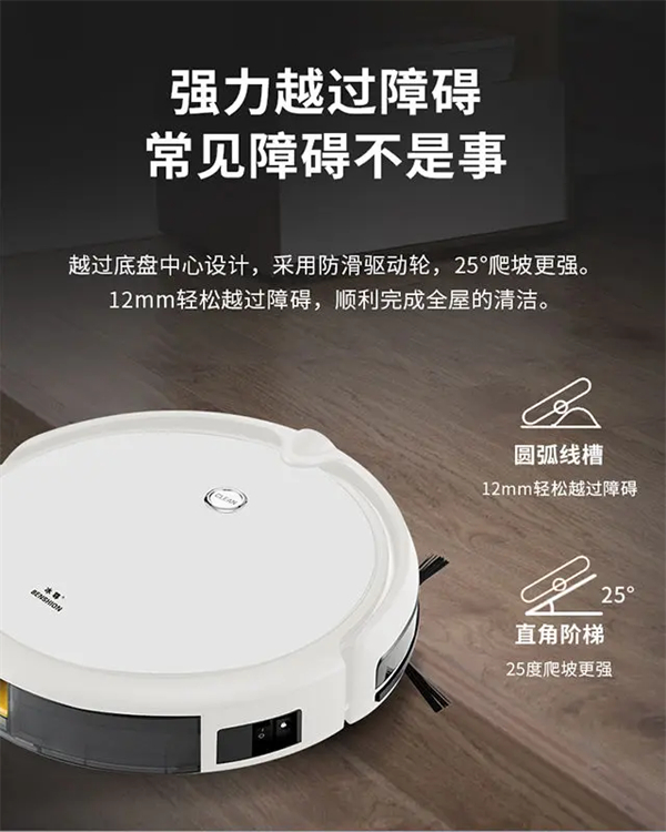 雅迎扫地机器人有约1500帕的吸力,双边刷,不漏扫,双向聚拢灰尘,电池容量有2400毫安,续航时间约70分钟,可以适用于多种地面。