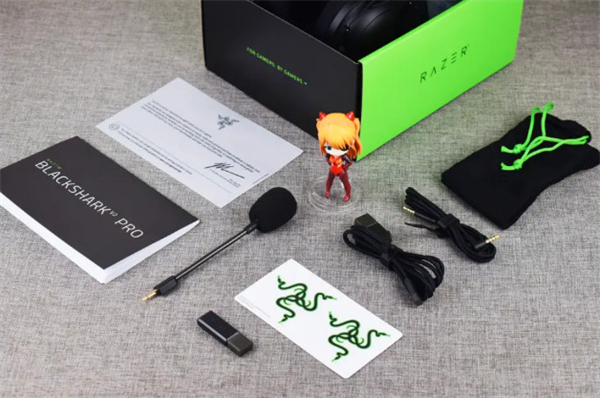 旋风黑鲨V2专业版的附件非常丰富,除了耳机本体和基本箱说外,还包含2.4G无线接收器、可拆卸麦克风、编织网包裹3.5mm音频线、编织网包裹micro-usb充电线以及收纳布绒袋,而作为传统,旋风黑鲨V2专业版也附送了标志性的雷蛇胶贴,由于耳机不支持RGB灯效,胶贴也是标准的黑绿配色款。