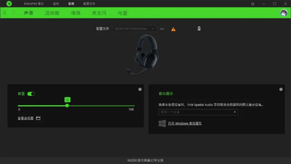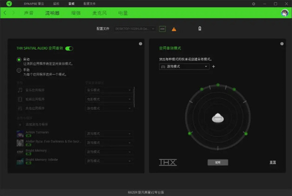 旋风黑鲨V2专业版的雷云3设置中,除了基本的音量大小调节外,还包含了内置的THX SPATIAL AUDIO音效混响器,这是一种通过软件算法来增强声音定位的环境音效,具体特性类似于FPS游戏中的声音定位,提升电竞游戏体验,同时该音效亦设有影院模式和音乐模式,满足不同需要。