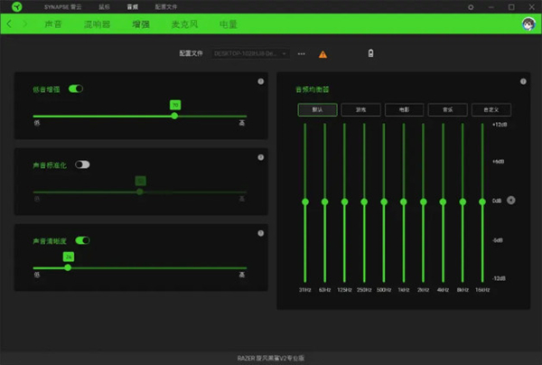 相较于THX SPATIAL AUDIO音效,管家更喜欢增强界面中的三组功能和EQ,这三组功能分别是低音增强、耳机声音标准化以及耳机声音清晰度,其中低音增强是给喜欢低频轰头的音乐爱好者用的;声音标准化是避免音量忽然提高;而声音清晰度则是管家最认可的,他可以大幅削减默认声音风格中的低频量感,让旋风黑鲨V2专业版有着类似于传统AKG的清晰中高频声音风格。