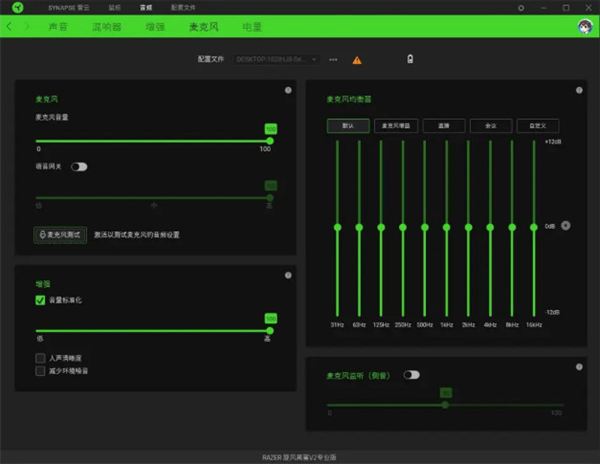 如果要说驱动优势的话,我想旋风黑鲨V2专业版的麦克风部分就是主要特点,麦克风本身除了音量调整外,还具备麦克风音量标准化、人声清晰度提升以及降噪功能,配合HYPERCLEAR麦克风表现相当出彩;另外麦克风部分还支持EQ,可以调整自己输入声音,配合语音网关和本机麦克风监听功能,应对游戏直播也是没问题的。