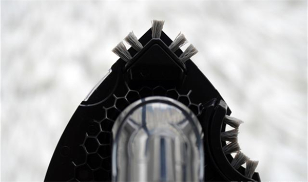 再来看一下刷头的结构,在刷毛的上方,是留有开孔的。当刷毛将脏污刷下来之后,会被瞬间吸进上方的开孔中。