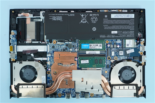 中间绿色部分是两根8GB DDR4 3200MHz的内存条,右边风扇和电池中间是M.2 2240 SSD和网卡,其中内存条卡槽和M.2 SSD玩家可自行更换。