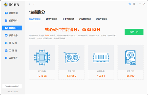 在硬件狗狗跑分总分是358352.超越了94%的笔记本用户。