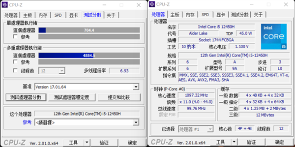 在CPU-Z分数测试中,酷睿i5-12450H单核得分704.4.多核得分4884.5.
