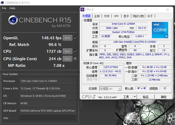 在CineBench R15测试中,酷睿i5-12450H最终跑分结果单核为244.多核为1727.