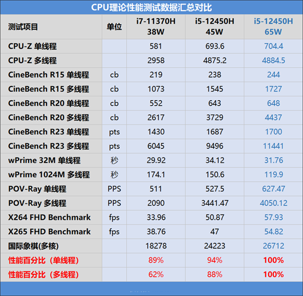 此前我们就测过用于轻薄本的i5-12450H,功耗释放限定在45W,现在开放到65W后,性能发挥更加充分,单核性能提升了大约6.5%,多核性能更是高了大约13.5%。