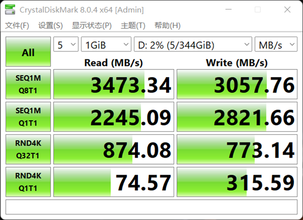 内置的硬盘在连续速度上,读取3473 MB/s,写入3058MB/s;4K随机速度,读取74 MB/s,写入316MB/s,属于较高端的PCIe 3.0 SSD水平。