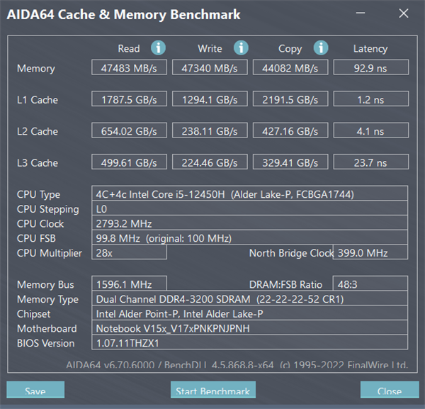 在AIDA64进行内存缓存测试,测得的读取、写入、复制带宽分别为47483MB/s、47340MB/s、44082MB/s,延迟为92.9ns。