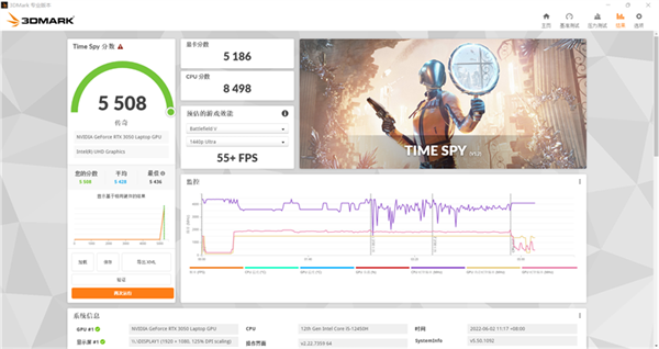 在3DMark的Time Spy(2K分辨率渲染)基准测试中,RTX 3050 Laptop给出了5508分。