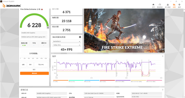 在Fire Strike Extreme(2K分辨率渲染)中,给出了6228分。